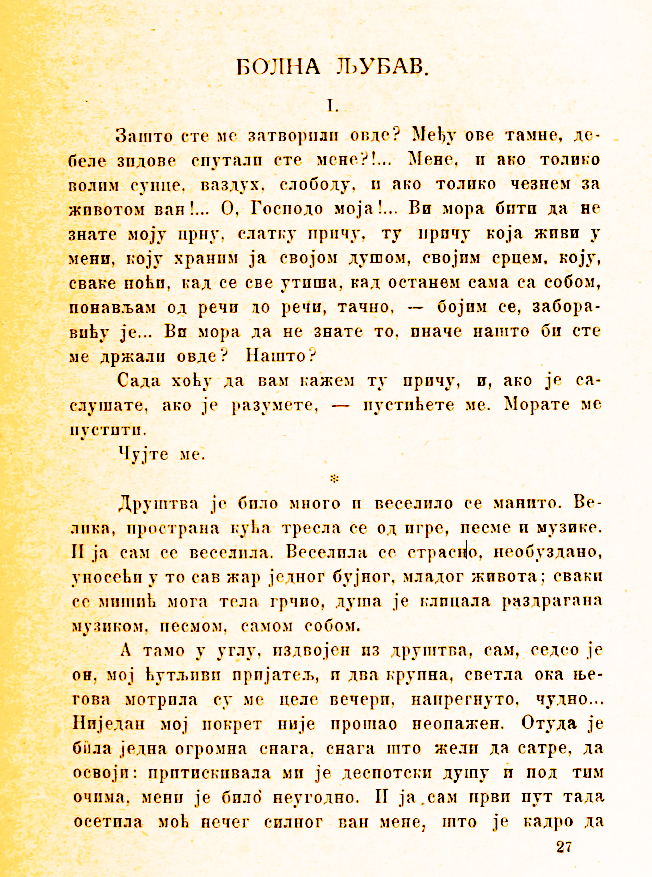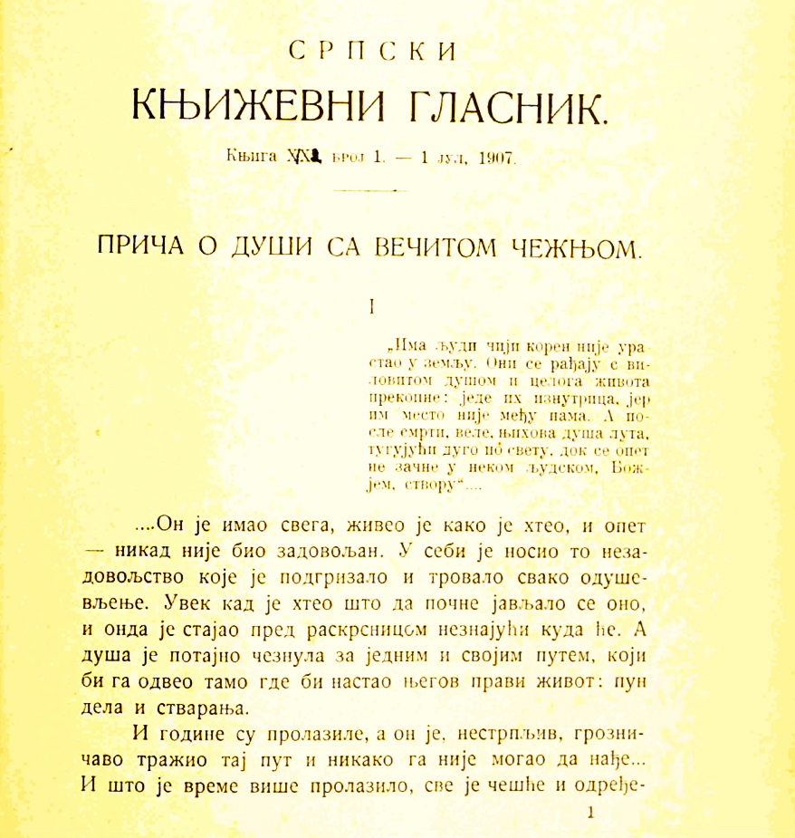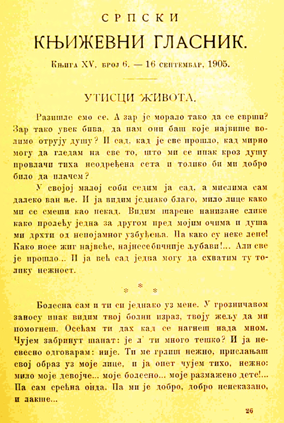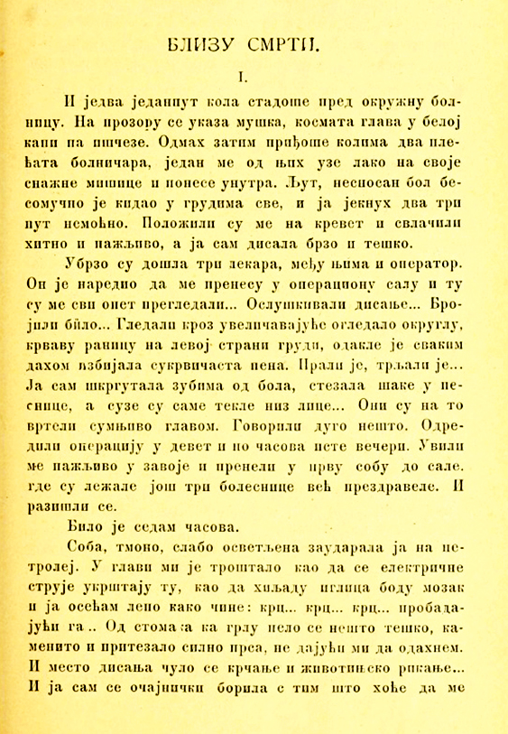 Најпре је објављена прича „Утисци живота“, а затим „Миришу јорговани“, „Близу смрти“, „Болна љубав“, „Прича о души са вечитом чежњом“ и постхумно „Земљи“ и „Мисли“.
