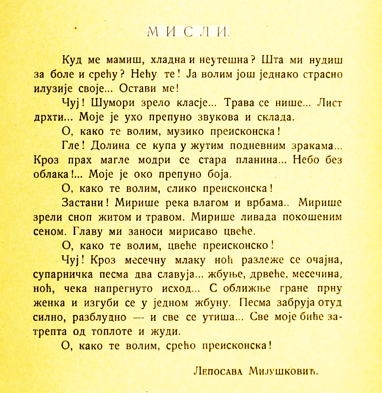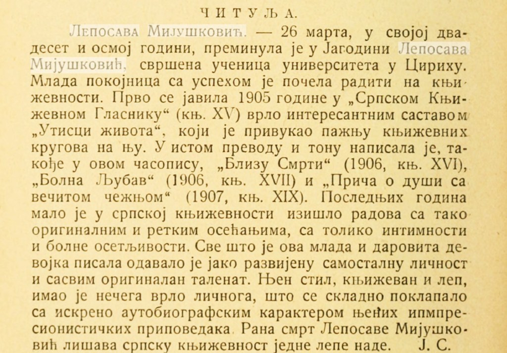 Скоро стотину година касније захваљујући текстовима у „Српском књижевном гласнику“ обнародовано је књижевно дело Лепосаве Мијушковић. Након њене смрти Скерлић је написао и ово: „… Последњих година мало је у српској књижевности изишло радова са тако оригиналним и ретким осећањима, са толико интимности и болне осетљивости. Све што је ова млада и даровита девојка писала одавало је јако развијену самосталну личност и сасвим оригиналан таленат…“.