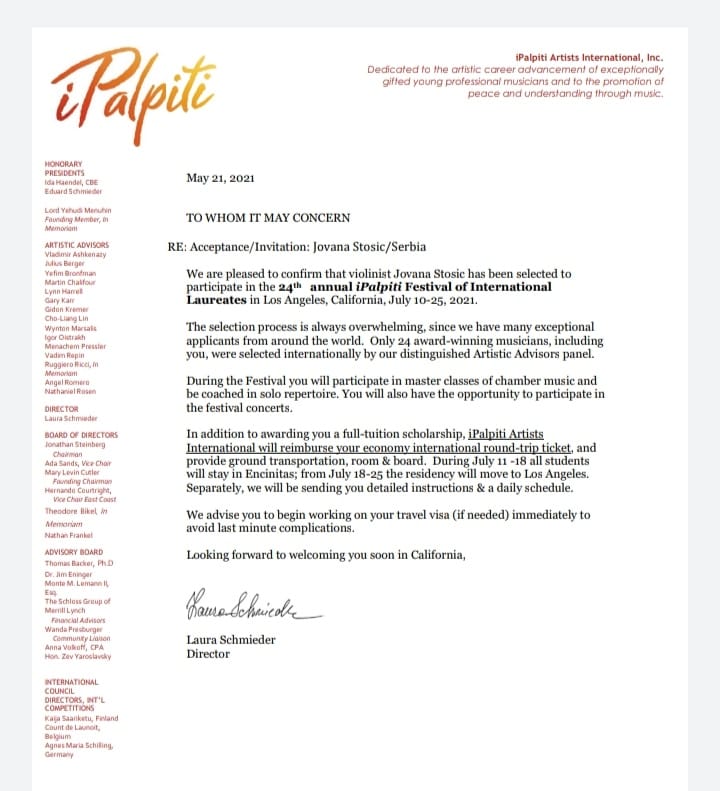 Јована је позвана 2021. године да у Лос Анђелесу наступа на Фестивалу интернационалних лауреата, пошто је једна од 24 изабраних из целог света. Због пандемије и локалних правила о корона вирусу настао је проблем у самом Лос Анђелесу, па се све одлаже за годину дана.