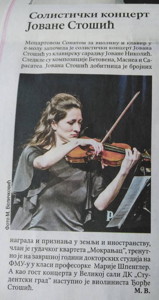 Остварила је запажене наступе не само у оквиру класе и Катедре, већ и бројне самосталне солистичке концерте у нашим најистакнутијим салама: Задужбина Илије М. Коларца (Музичка галерија и Велика дворана), Гварнериус-Центар лепих уметности Јована Колунџије, САНУ – Галерија Српске академије наука и уметности, ДКЦБ – Дечји културни центар Београда, Галерија АРТГЕТ, Сава Центар, Кућа Ђуре Јакшића, СКЦ – Студентски културни центар, Музеј Народног позоришта, Модерна галерија Лазаревац, Културни центар „Милош Црњански“, Сала Градске Куће Ужице… Свирала је као солиста са камерним оркестром Камерата Сербика на Новогодишњем концерту у великој сали Сава Центра. Такође је наступала и као солиста уз пратњу камерног гудачког оркестра БГО Душан Сковран у Великој дворани Коларчеве задужбине, изводивши виртуозни комад „Интродукцију и рондо капричиозо“ од Камиј Сен-Санса.