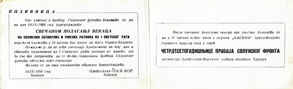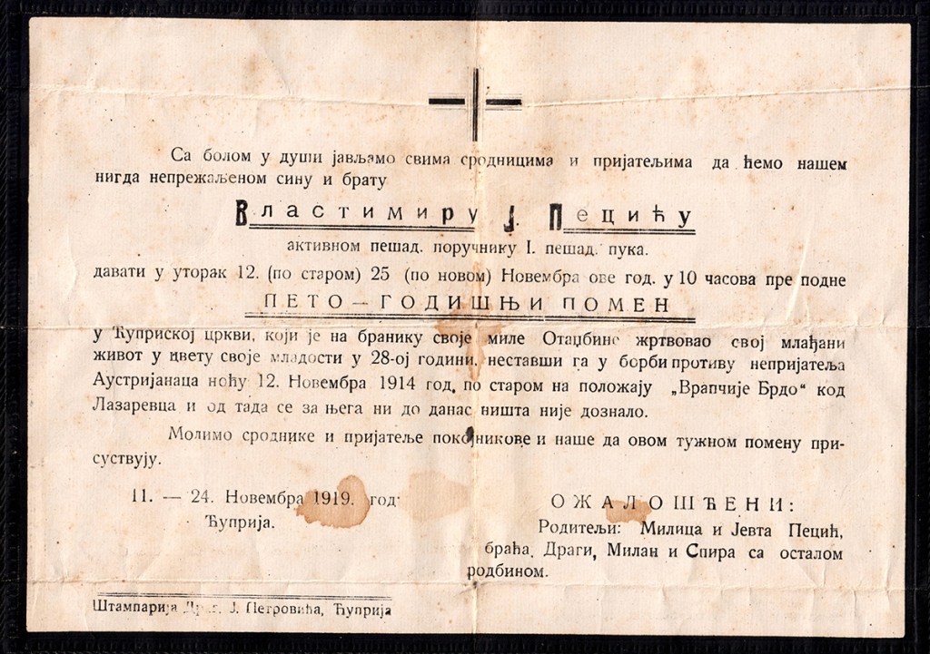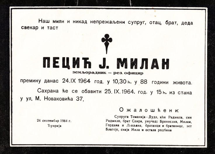 Током обележавања 40 година од пробоја Солунског фронта, новембра месеца 1958. године био је позван да присуствује општинским свечаностима. Док је мирно стајао у центру града испред споменика настрадалим Ћупричанима, вероватно се присећао како је Арчибалд Рајс говорио у Ћуприји након освећења тог споменика. Мисли су му биле с братом Властимиром Пецићем чије је име уклесано на споменик.
