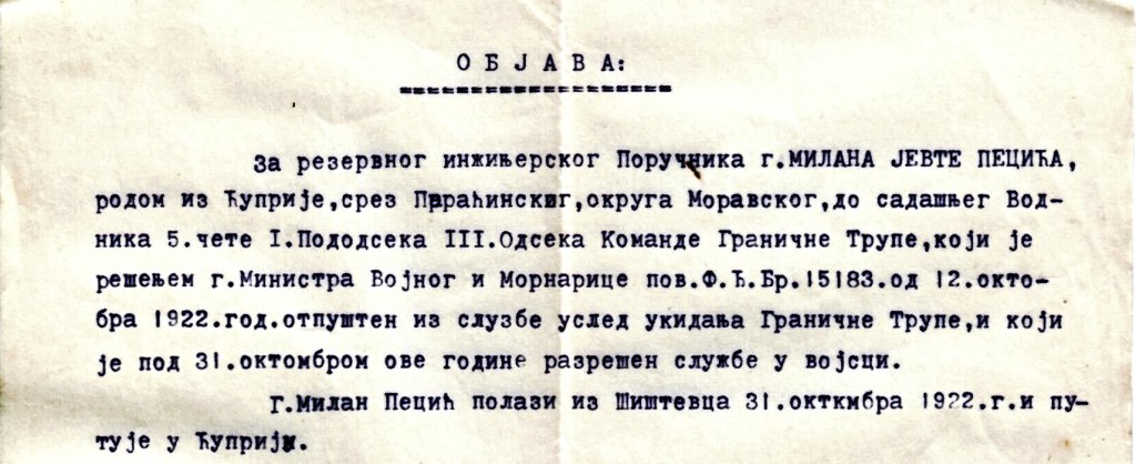 Војнички дисциплинован, комитски неустрашив, Милан је у општинској управи оцењен најбољом оценом, а што се потврђује писаним документима. Али висока оцена није била довољна за останак у државној служби – ратне заслуге су подређене припадности одређеној политичкој странци. Милан Пецић је опет био само земљорадник који издржава породицу од пољопривреде.