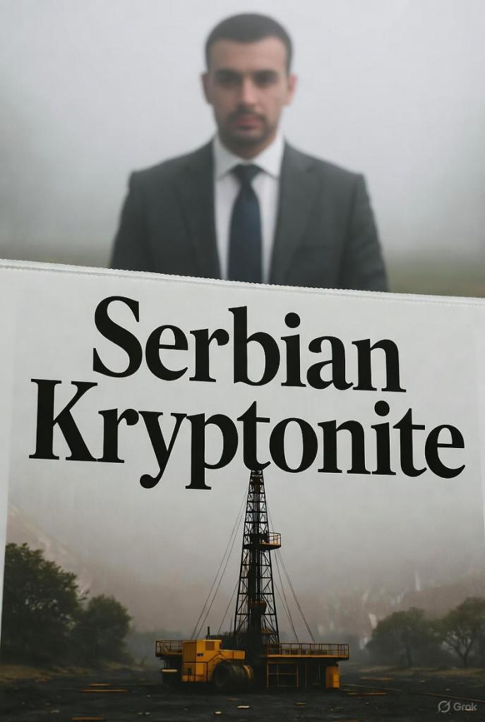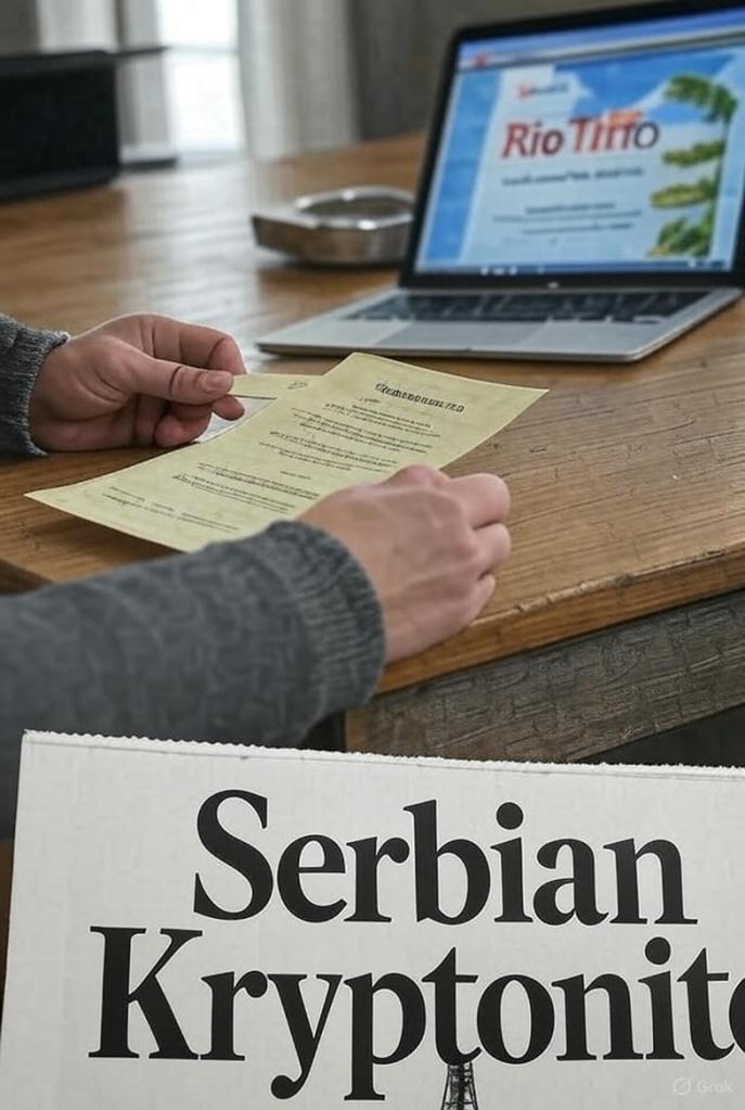 Извод из новинског чланка, 2004. „Компанија Рио Тинто објавила је откриће јадарита у Србији. Минерал садржи литијум и бор, кључне елементе за будућност енергетике.“ Вуковић је истргнуо из новина исечак са насловом „Српски криптонит“; испод је била слика бушотине у магли, а у позадини, фигура у оделу – Душан Ковачевић, консултант Рио Тинта.