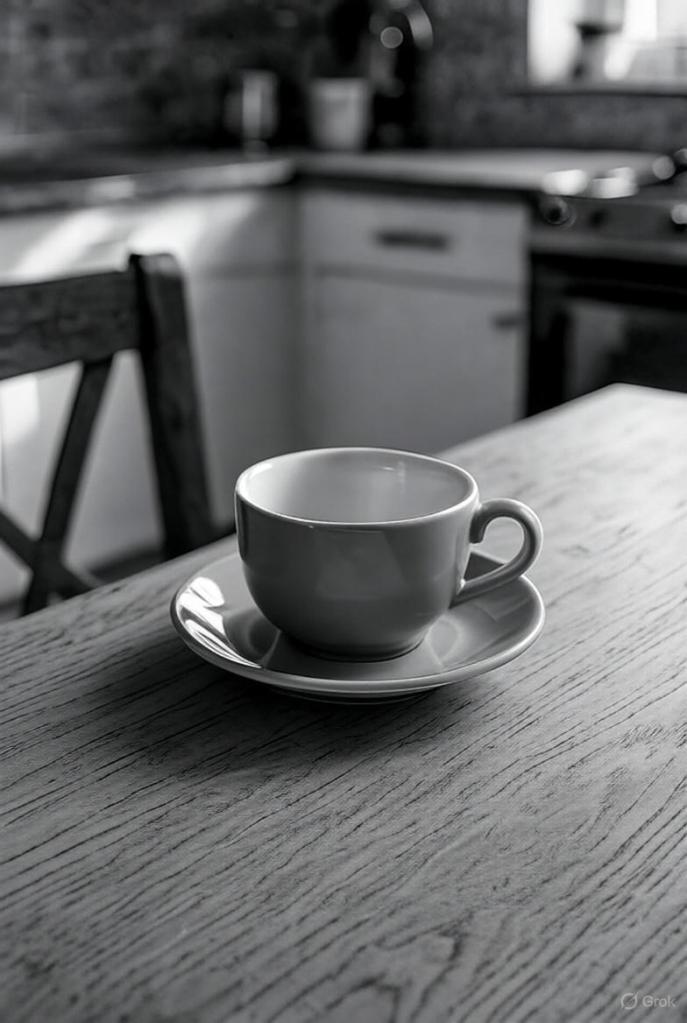 (Фотографија: црно-бела, колиба у магли. Две силуете за столом. Једна рука држи чашу чаја, друга – стиснуту песницу.)