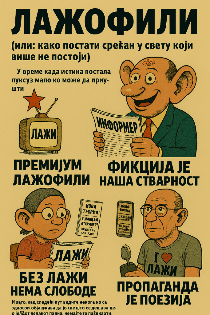 Постоји и посебна подврста – премијум лажофили. Они не верују само у једну лажу. Они имају портфолио лажи. Једна за геополитику, друга за економију, трећа за здравље, четврта за историју. Свака лаж има своју естетику, своје хероје, своје злочинце, своју музику. Као да је живот Нетфликс серија са више сезона и више паралелних прича. Премијум лажофил никада не гледа само једну сезону. Он их све прати истовремено и никада не спојлује себи крај, јер краја нема.