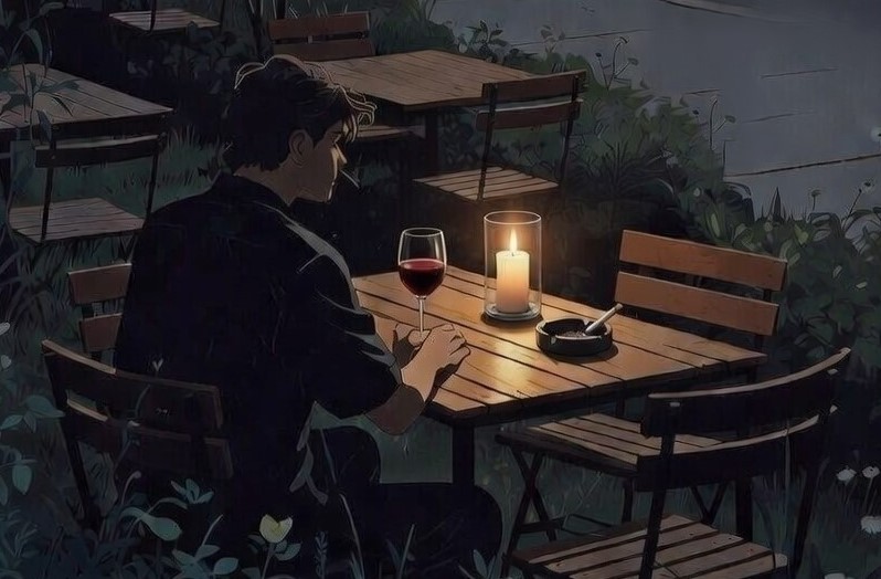 Седео сам сам. Чаша испред мене била је до пола пуна, а ја сам је гледао као да ће ми сама рећи нешто паметно – блистала је под светлом свеће као да у себи крије неку тајну. Гледао сам је дуго, упорно, као да ће једног тренутка проговорити и спасити ме од тишине. Али све што сам чуо био је звук сопственог дисања, тежак и спор, као да се и оно уморило од мене.