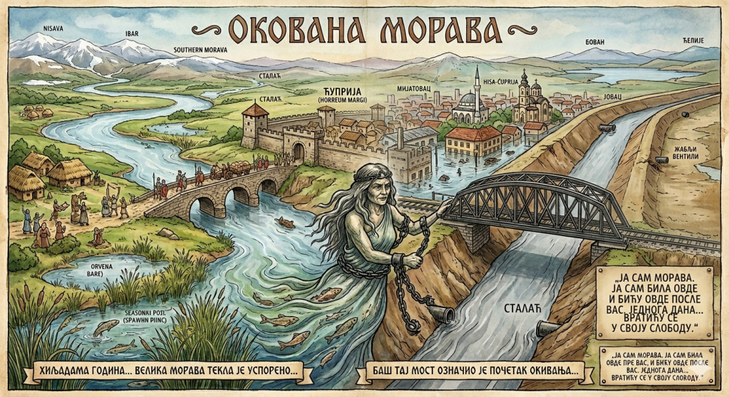 Миленијумима је Велика Морава пулсирала од Сталаћа до Дунава, носећи у свом мутном крилу само срце планина. Није то била само вода; био је то живи, успорени ритам земље. Сваког пролећа, када би сунце зарило своје зубе у снегове око Нишаве и Јужне Мораве, око Ибра и Западне Мораве, река би се, попут џина који се протеже, изливала по пољима.