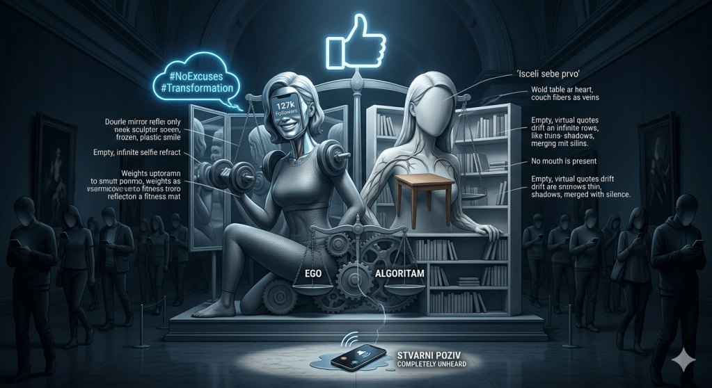 У фитнес студију, где огледала гутају зној и неонску светлост, жена је седела на простирци. Тегови око ње стајали су као стражари, боце воде као трофеји. Њено веровање било је просто: ако довољно дуго позира пред објективом, ако алгоритам довољно упорно гура њене селфије у туђе животе, једног дана ће се коначно родити. Не као обична жена, већ као „гуру”, она која спасава тела. Засад јој је највећа победа била то што је телефон научила да окине сам, дајући јој прилику да зажмури и замисли хиљаде очију које је посматрају.
