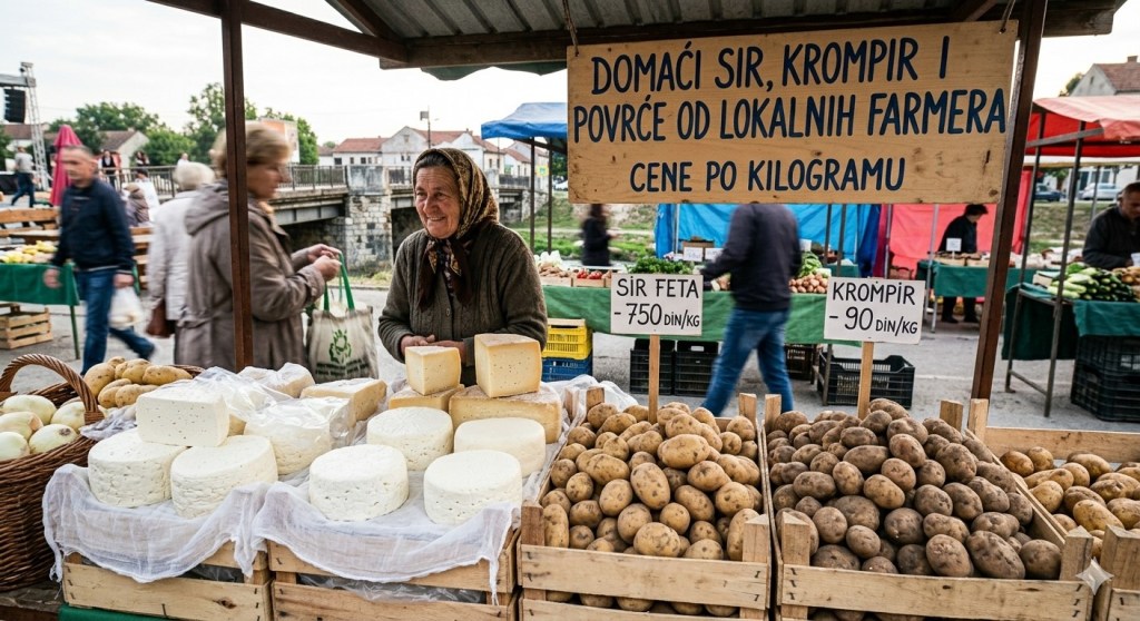 На пијачним тезгама, на сваком картону – Sir, Krompir, Jaja – натписи су били на латиници.