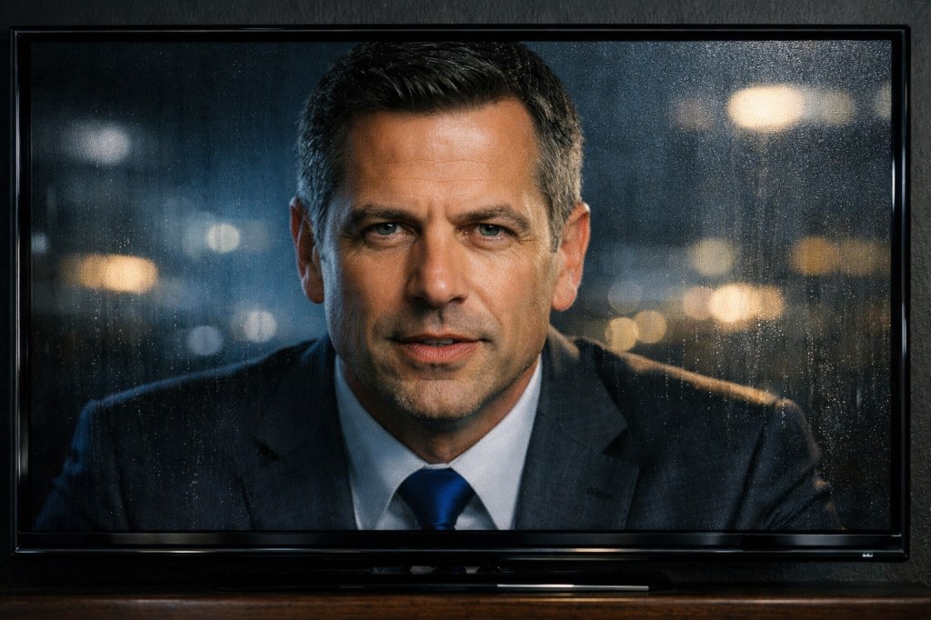 Посматрач седи у фотељи и укључује телевизор. Време је ударних вести. Лице спикера је глатко, пажљиво осветљено. Глас дубок, тембриран.