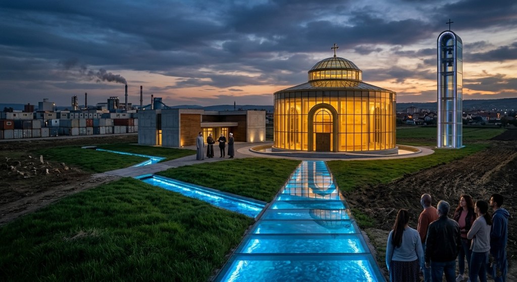 Игор је раширио папир на хауби лимузине. „Ово није класична црква. ЕУ фондови су захтевали одрживост. Зато нема зидова који деле. Богомоља је од стакла боје меда. Светлост одозго пада на све подједнако.“